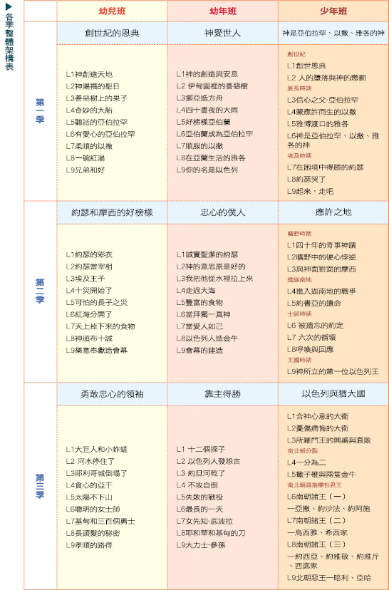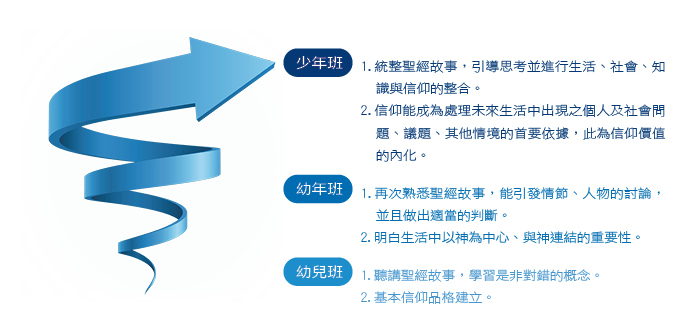 新課程延續舊課程的「螺旋式」課程設計進行,其優點在於「由淺到難」、「新經驗建立在舊經驗之上」、「有順序有組織的循環」、「明確的課程架構」、「提供實體教具」。按照幼兒班、幼年班、少年班學員的認知發展階段,我們可分成三個循環來學習聖經真理: