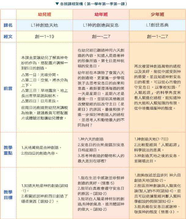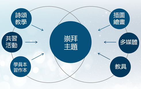 除了有順序、有規劃的課程規劃之外,各領域依據崇拜課程教學目標,設計詩頌、共習、習作等課程,插圖表格、E化的PPT與影片、上課使用教具等均配合崇拜主題。