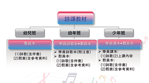 學員本:考量學員年齡與程度,幼兒班不出版詩歌本,幼年班出版附注音的學員本,少年班則是配合上課需要,課本中除了詩歌外,還會有相關樂理或上課練習。