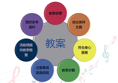 教員本:則是各班統一以「一課一教案」方式編排,提供該課教唱詩歌與教案,以方便對照與備課。教案中並將課程中需要的參考資料都收錄其中。