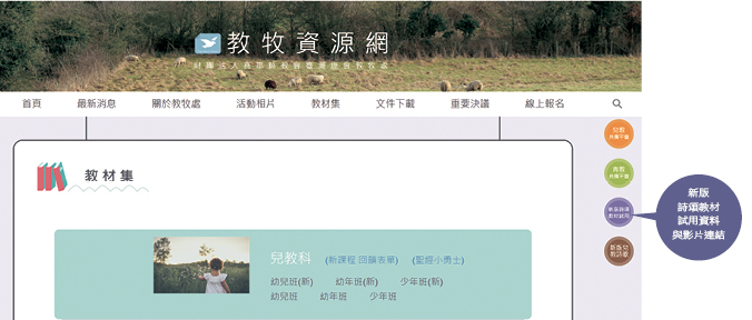為方便各教會進行新課程詩頌教材試用,在教牧資源網中開設連結,提供試用教材與回饋,歡迎各教會下載試用,更期待給予回饋,提出問題與建議,作為改進之參考,期使未來正式推出時,提供更實用之詩頌教材。