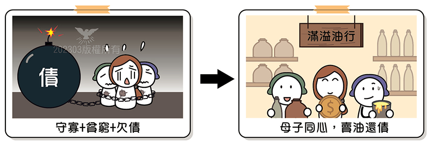 門徒的妻遭逢變故,不但沒有遠離神,反而緊抓住神。她向先知求救,照實陳述家中困境,不怕被人知道家裡貧窮又欠債;她也積極向鄰居求助,這些借來的瓶瓶罐罐,盛滿恩典之油,讓這家人可以賣油還債。