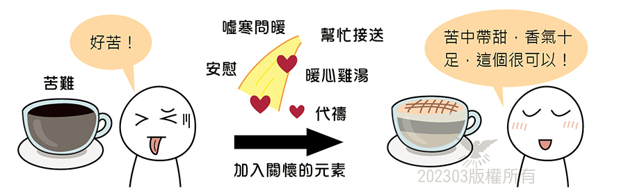 旁人的關懷沒辦法改變已經發生的事,可能也無法解決問題,卻可以改變當事人經歷苦難的感受,讓難過的事變得可以忍受;如同在苦澀的濃縮咖啡裡,加入牛奶和香草糖漿,再蓋上厚厚的奶泡,最後淋上焦糖,變成香甜可口的焦糖瑪奇朵。雖然加入的佐料沒有改變咖啡的本質,咖啡依舊是咖啡,沒有變成蜂蜜,但整杯飲品嚐起來的滋味卻截然不同,更容易被接受。
