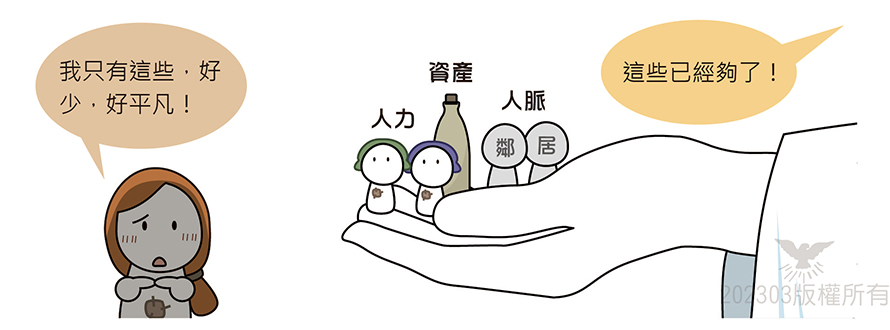 我們總是認為,想要解決困難,資產要夠多,能力要夠強,還要認識有影響力的大人物。如果你有這些,就憑著感謝的心,多加善用;如果你沒有這麼多,也不用擔心,因為不管人擁有多少,對神來說都已經足夠,祂照樣可以施展神奇,解決難題。