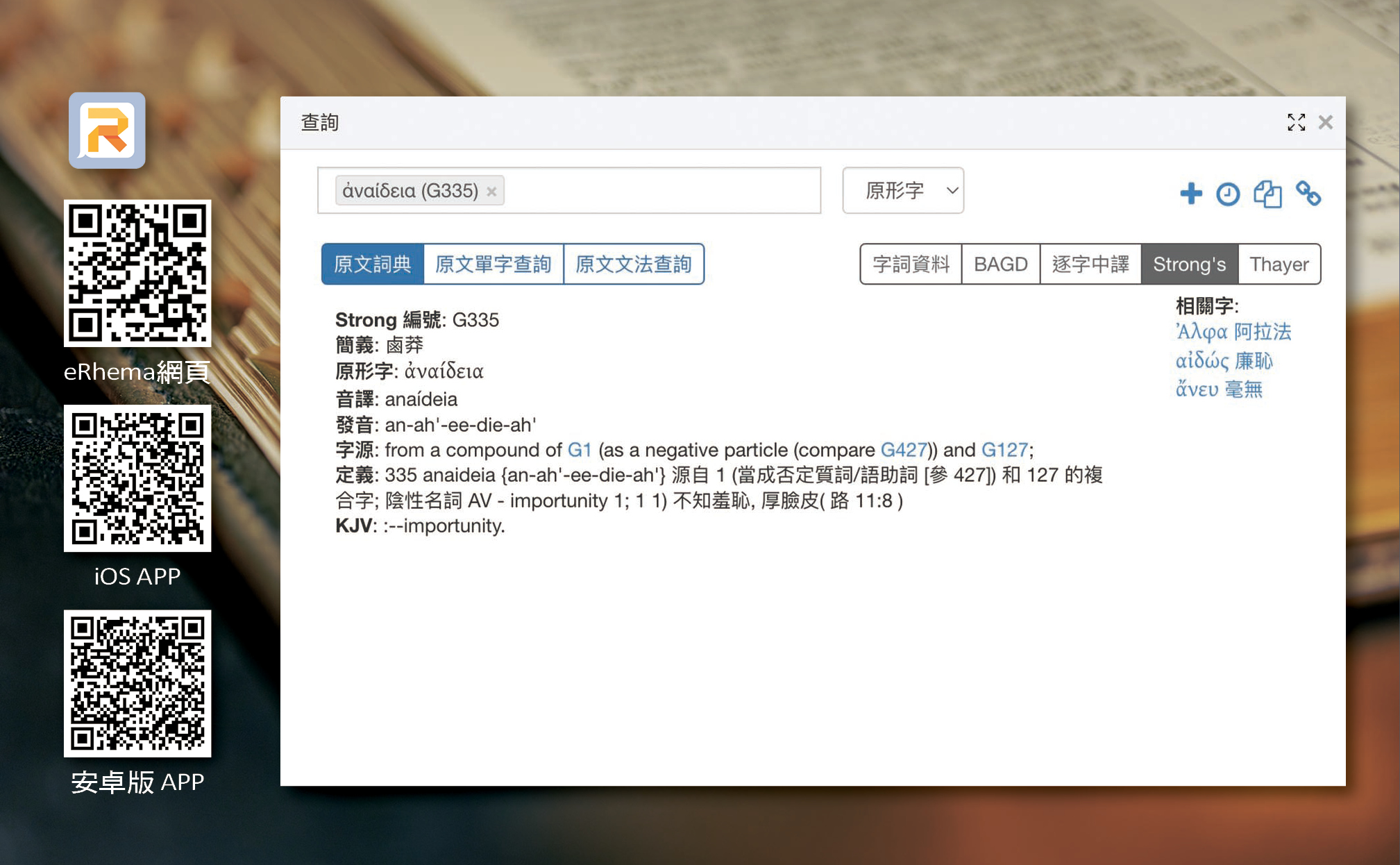 同一個希伯來文或希臘文字詞,時常在不同地方被譯為不同的中文字詞,所以我們很容易忽略同一個字詞在一段經文裡的重複。若同一字詞在同一個經節中重複出現時,我們可透過 Strong’s 編碼來查閱重複的編號。然而,如果要在較長的經文段落中找出重複的字詞,就比較有挑戰性。瑞馬聖經工具提供了一項功能,可以幫助我們快速找到某段經文裡重複的字詞。