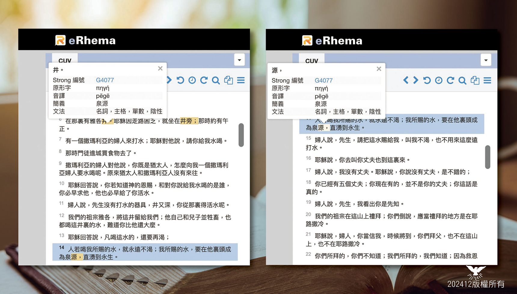 「泉源」這個字對應 Strong’s 編號 G4077。當點選「源」這個字時,該字會被點亮,接著往這段經文的上方瀏覽,便可看到第6節中的「井」也同樣亮著。我們可以進一步確認,第6節中「井」的 Strong’s 編號也是 G4077,表示在希臘文中,「井」與「泉源」為同一個字。我們用這個同步字詞標記的功能,就可看出,作者特意將耶穌要給信祂之人的「泉源」,與耶穌開始宣道時所坐之井旁的「井」連結在一起。