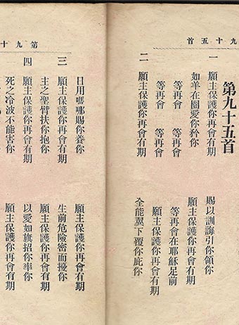 眾人心被恩感,在會中口頌讚美詩《願主保護你再會有期》。其詩歌曲調與歌詞,生動表達了神學會師生們在主裡的融洽,以及神大能的恩典。下圖為84年前所使用之詩本第95首(今123首),僅附歌詞,無歌譜與主題。讀者若能邊品閱邊清唱此詩歌,更能體會當年眾學員的心境。