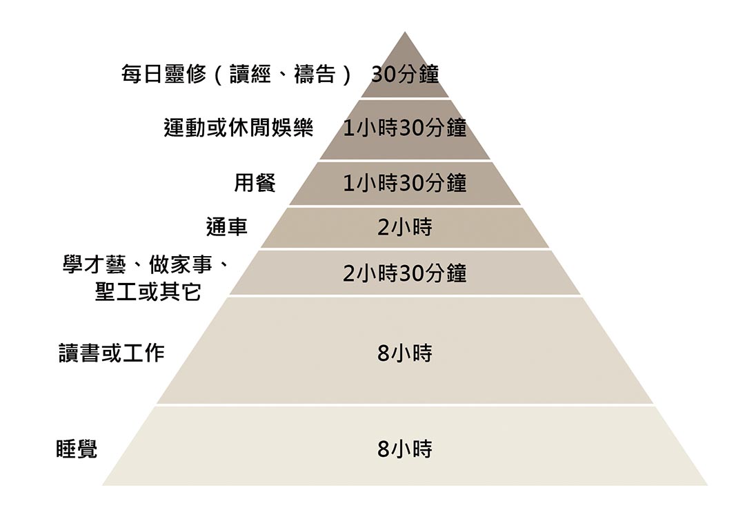 身為基督徒的你,會不會覺得在時間安排上,要妥善分配現實生活中的事務和教會事工,並不容易?除了忙於課業,還要學習音樂或其他才藝,同時兼顧運動和休閒娛樂,再加上教會事工……。究竟生活和信仰要如何拿捏,才能達到均衡的狀態呢?聖經提到:「操練身體,益處還少;惟獨敬虔,凡事都有益處,因有今生和來生的應許」(提前四8)。可見,多花一些時間在靈修上,所得到的益處會大於運動及休閒娛樂。