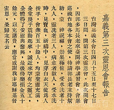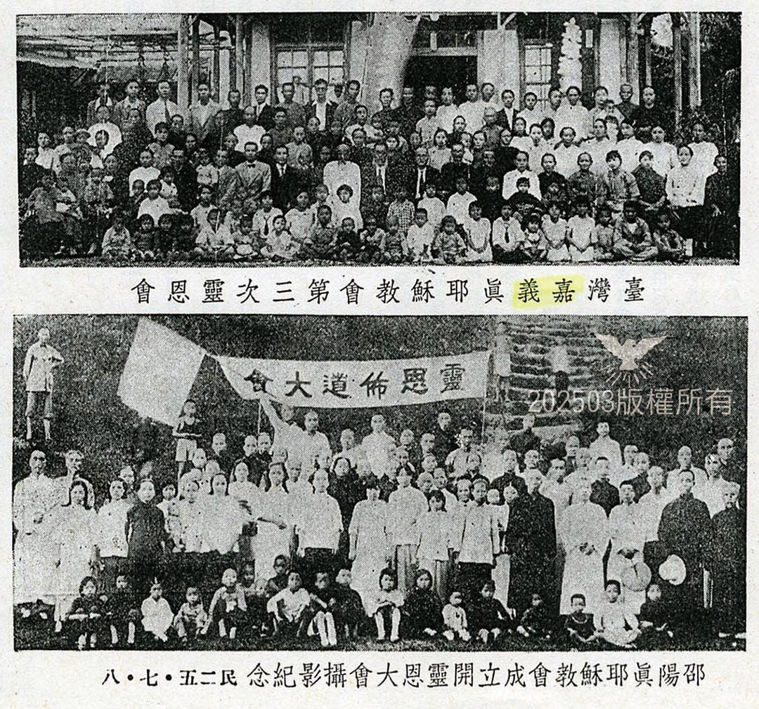 23. 詳情再參閱《聖靈報》嘉義教會靈恩會概況,另有〈嘉義第三次靈恩會報告〉(《聖靈報》第十一卷 第五期,1936-5-31,頁107);《嘉義教會成立70週年紀念特刊》,頁9,也有刊登此老照片,唯本文照片較為清晰。註:2020年9月5日(六)17:40 點記錄。
