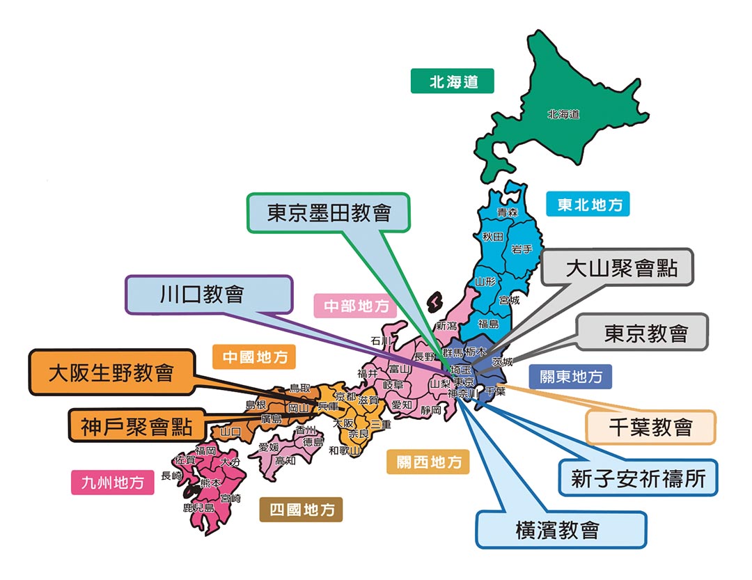 在神奇妙的引領下,2015年4月,橫濱教會與千葉教會相繼成立;2018年10月28日,川口教會正式獻堂;2024年5月5日,大阪生野教會也蒙主恩典,成立並且獻堂。期間歷經數位國外傳道、長執、負責人及教會同工的栽種與澆灌,如今神使它生長(林前三6-9)。