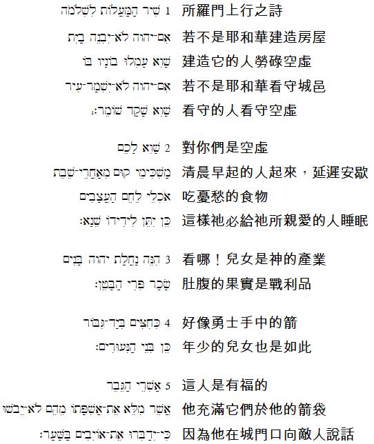 詩人從第3節起,突然話鋒一轉,描述的主題從房屋、城邑突然轉到兒女,看似有點唐突,然而所羅門知道建造不僅是外面的工作,更是內在的增長,因為房屋只是硬體,是外殼,更重要的是住在房屋內的人。例如秦始皇所建立的統一帝國,到了他兒子就分崩離析,追究其失敗的原因,並不是北邊的匈奴,反而是內部的造反。