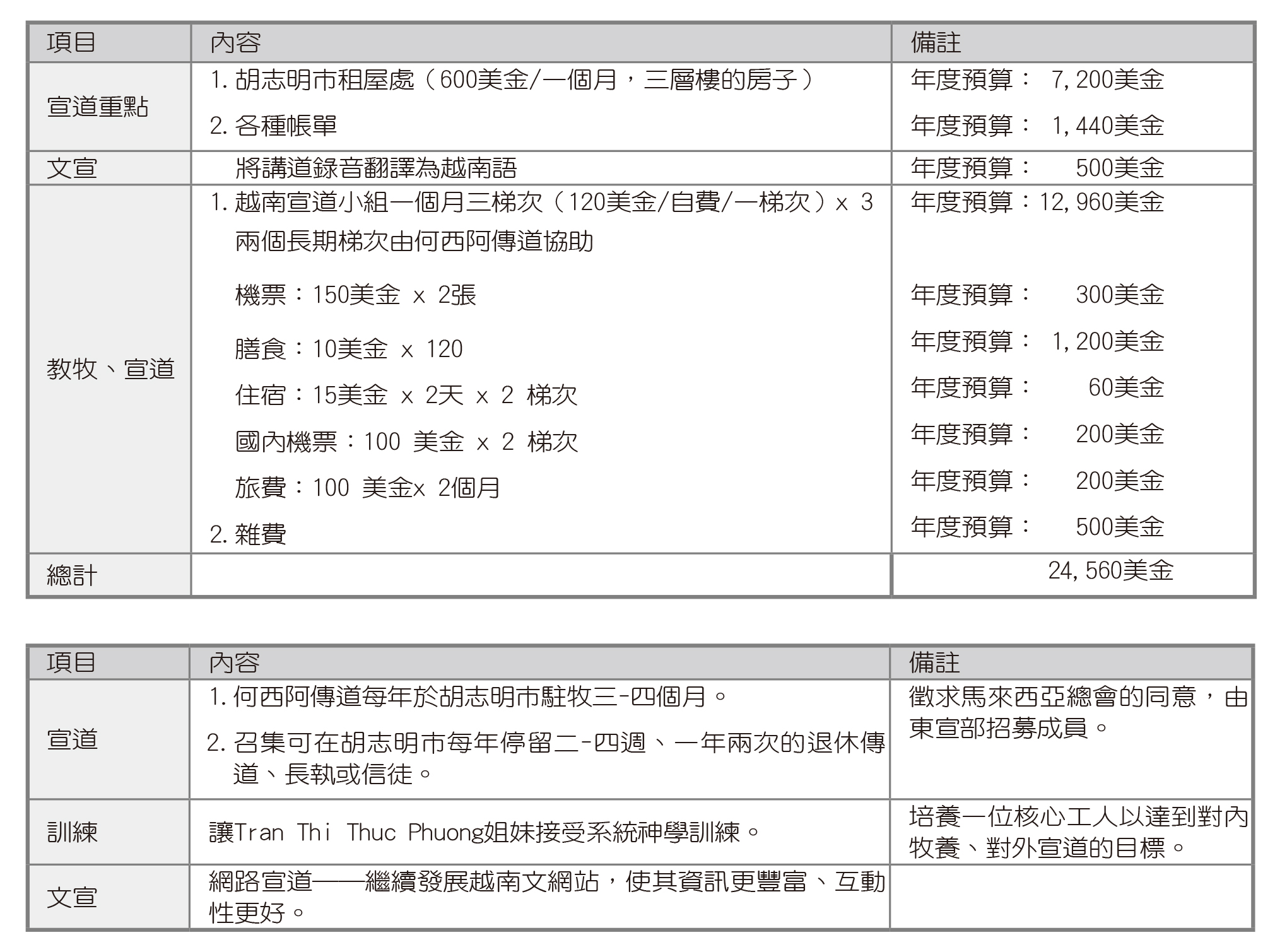 ‧訓練──目前有一位新加坡信徒住在胡志明市。國外工人不在的期間,便由他來帶領聚會。一位當地信徒曾參加過在新加坡舉辦的短期神學訓練班,我們希望能對她多加訓練,以期未來她能以越南語直接帶領教牧及宣道的聚會。