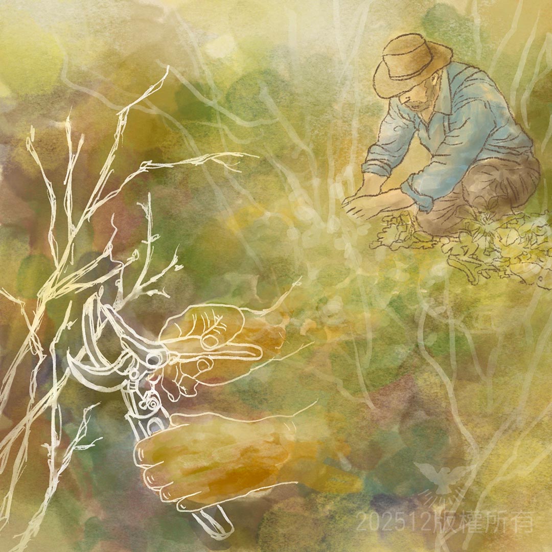 主耶穌用葡萄樹與枝子來說明我們與祂的關係,我們的生命是與主連結的,但是在生命的歷程中,主要透過各種苦難或試煉修剪我們。